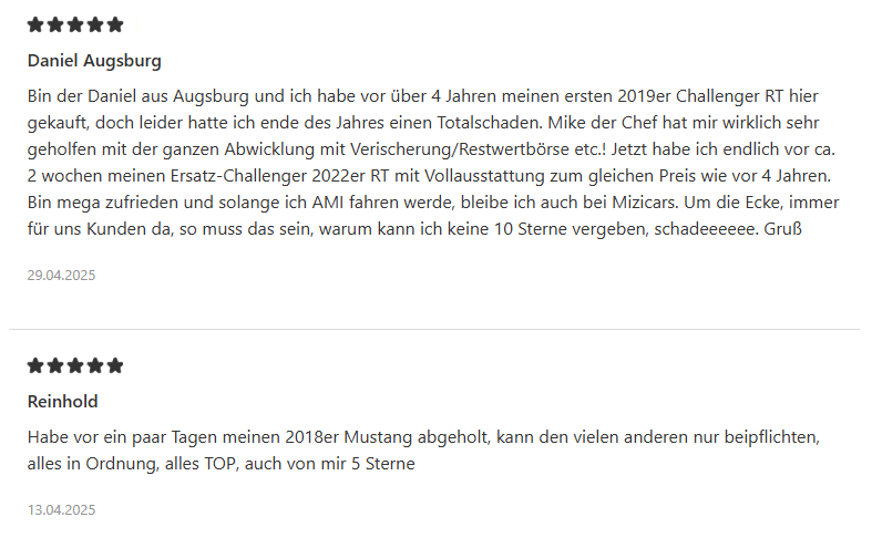 „Ich habe bei Mizicars einen Ford Mustang gekauft. Ich bin rundum zufrieden, Auto ist top zu einem fairen Preis, sehr freundliche und kompetente Beratung mit gutem Service. Würde mir jederzeit dort wieder ein Auto kaufen und kann Mizicars nur weiterempfehlen.“